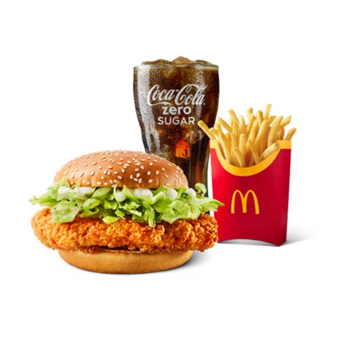 Hou je van pit? Kies dan voor de Friends Meal voor volwassenen met Spicy McChicken! Een knapperige kipfilet met een pittige twist, frisse sla en romige saus op een zacht broodje. Compleet met frietjes, een verfrissend drankje en een Friends-figuurtje. Spice up your meal!